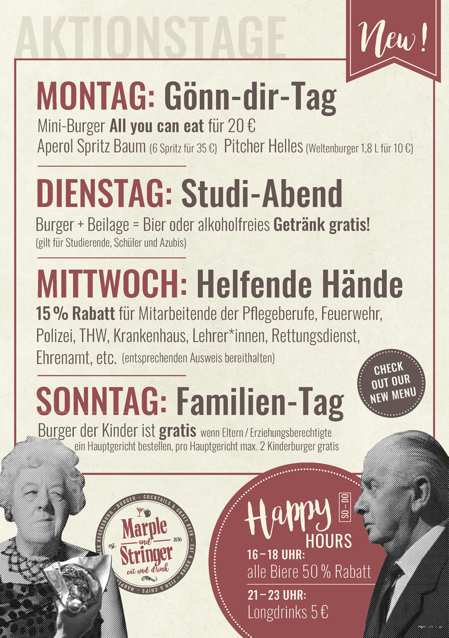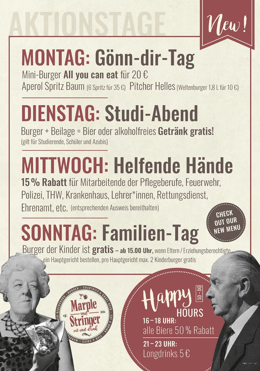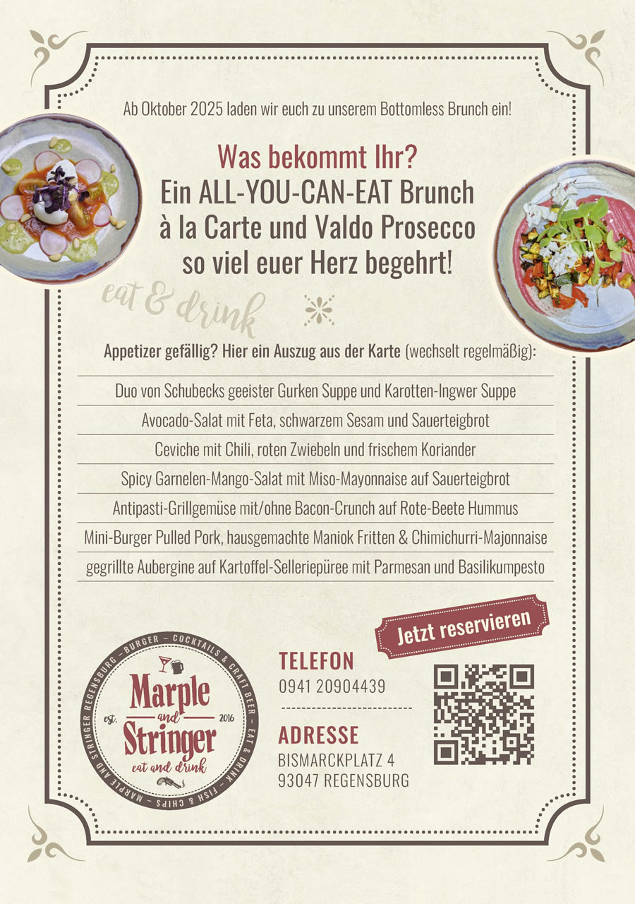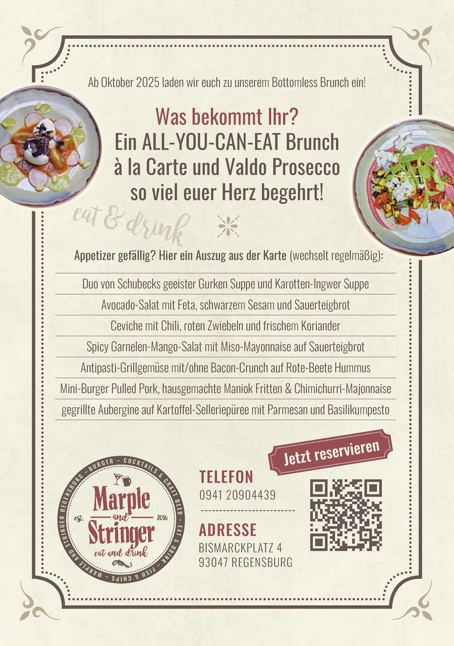 Für Drink-Lover, Cocktail-Verrückte oder Finger-Street-Food-Junkies gibt es endlich einen neuen Hotspot in der Regensburger Altstadt. Das Marple and Stringer am Bismarckplatz versorgt euch mit abwechslungsreichen Streetfood-Kreationen, kreativen Cocktail-Konzepten und good old fashioned Drinks. Bei uns erwarten euch neben ausgewähltem Craft Beer und zahlreichen frischen Cocktail-Ideen hausgemachte Burger, saftiges Pulled Pork sowie leckere Sandwiches und stets angenehme Gäste. Im Winter helfen kreative Heißgetränke beim Aufwärmen.